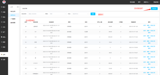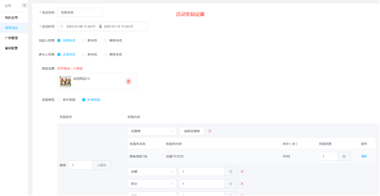 可自定义活动页面名称/添加轮播图广告/查看活动商品/查看活动规则/查看参加活动情况。