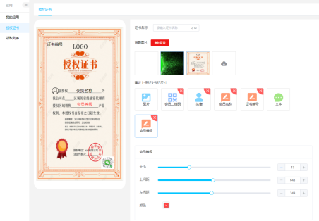 推荐购买的人数详情,订单情况,以及奖励明细都能看到。 ![]() ![]() 新增功能插件【授权证书】 功能简介: 可设置每个会员生成自己的授权证书,后台可设置授权证书的背景页、证书信息布局等等。 后台插件位置