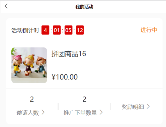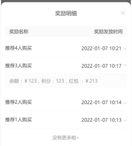 可看到活动的推荐人数,下单数,奖励明细的记录。