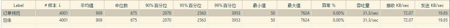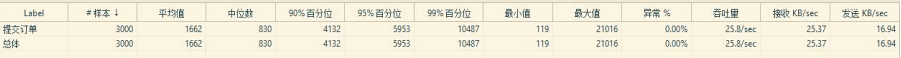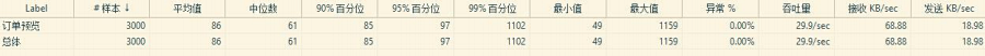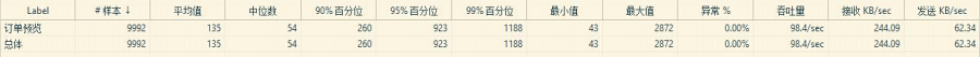 5.订单提交并发量 ●说明:订单提交在没有使用队列的单线程的情况下进行测试,使用队列多线程可以提升 5 倍左右。 ●**状态为:2600 左右 ●测试结果分析 : 3000 请求时 95%访问时间在 5 秒左右 ●3000 请求/100S