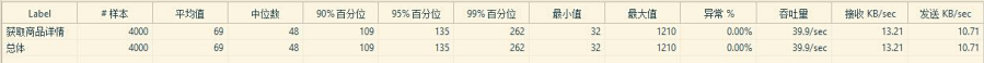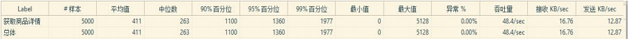 2.商品详情访问量 ●说明:商品详情页按照实际运营需求发布了完成的商品详情页。 ●**状态为:5500 左右 ●测试结果分析 : 4000 请求时 95%访问时间在 135 毫秒内,5000 请求时 95%访问时间在 1 秒 左右。 ●4000 请求/100S