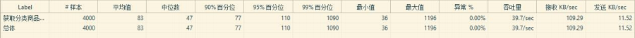 3.商品列表访问量 ●说明:商品列表页按照实际运营需求发布了 72 个商品。 ●**状态为:4500 左右 ●测试结果分析 ; 4000 请求时 95%访问时间在 110 毫秒内,5000 请求时 95%访问时间在 3 秒 左右。 ●4000 请求/100S