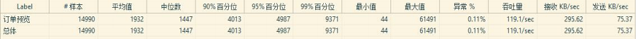 2.订单提交预览量 ●说明:订单提交预览在没有使用队列的情况下进行,使用队列可以提升 5 倍左右。 ●**状态为:12000 左右 ●测试结果分析 : 10000 请求时 95%访问时间在 923 毫秒内,15000 请求时 95%访问时间在 5 秒内。 ●10000 请求/100S