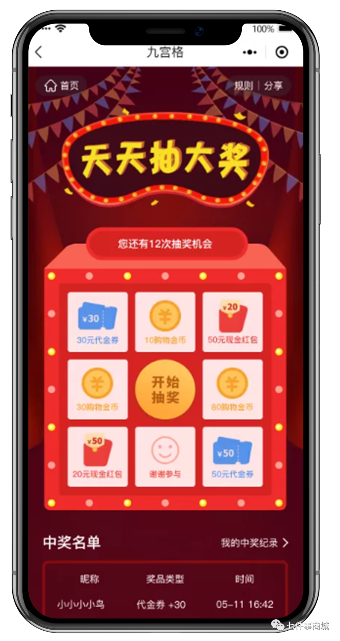一、使用规则: 1、九宫格抽奖活动:后台可设置八个奖品让用户进行抽奖。 2、可设置用户参与抽奖的次数,可按天或者按总次数设置。 3、可设置用户需要消耗n积分才可抽奖一次。 4、奖品分为五种类型:余额、优惠券、积分、商品、谢谢参与。 5、可设置用户中奖的概率。 6、九宫格抽奖的商品参与佣金分润。 二、下面给大家展示前端: 首页展示