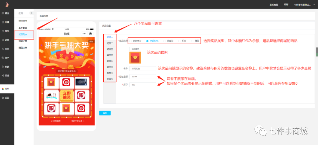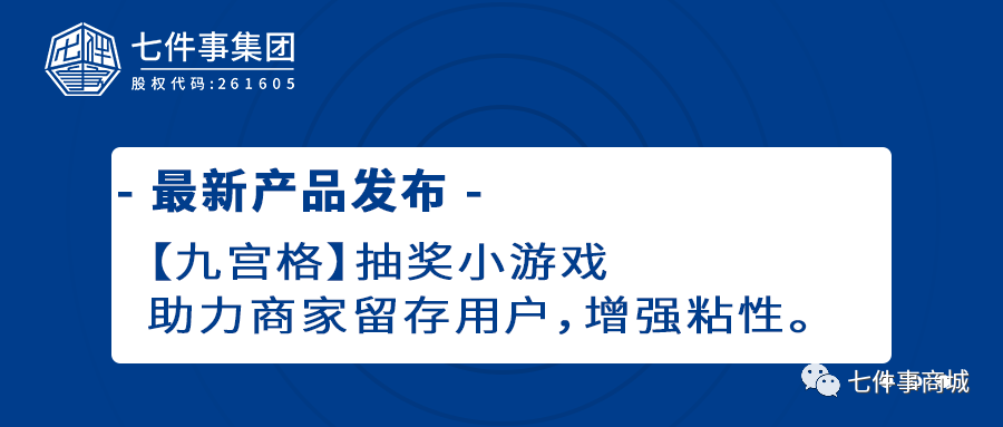 【新功能发布】七件事最新研发九宫格小游戏,助力商家激活用户留存发表时间:2021-09-30 19:11 前言: 时代进步飞速,企业竞争更是日益增长。七件事为了结合市场用户需求,为客户创造价值,七件事最新研发【九宫格】是一种抽奖小游戏,目的是激活用户,帮助企业实现业绩增长。抽奖已经成为很多企业活动的标配,毕竟奖品的价值是用户参与活动的重要因素,九宫格是一种比较有趣的抽奖形式,它能够吸引大量用户的关注,对于企业商家来说是一种商家沉淀、拉新用户的必备工具之一。 功能亮点:8种奖品自由设计,用户参与简单,娱乐度高。