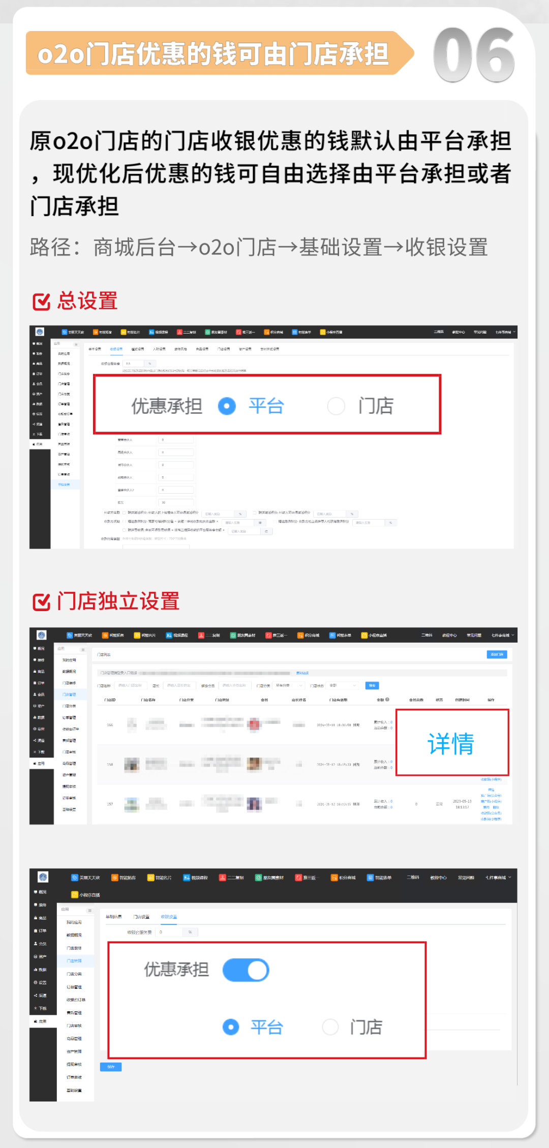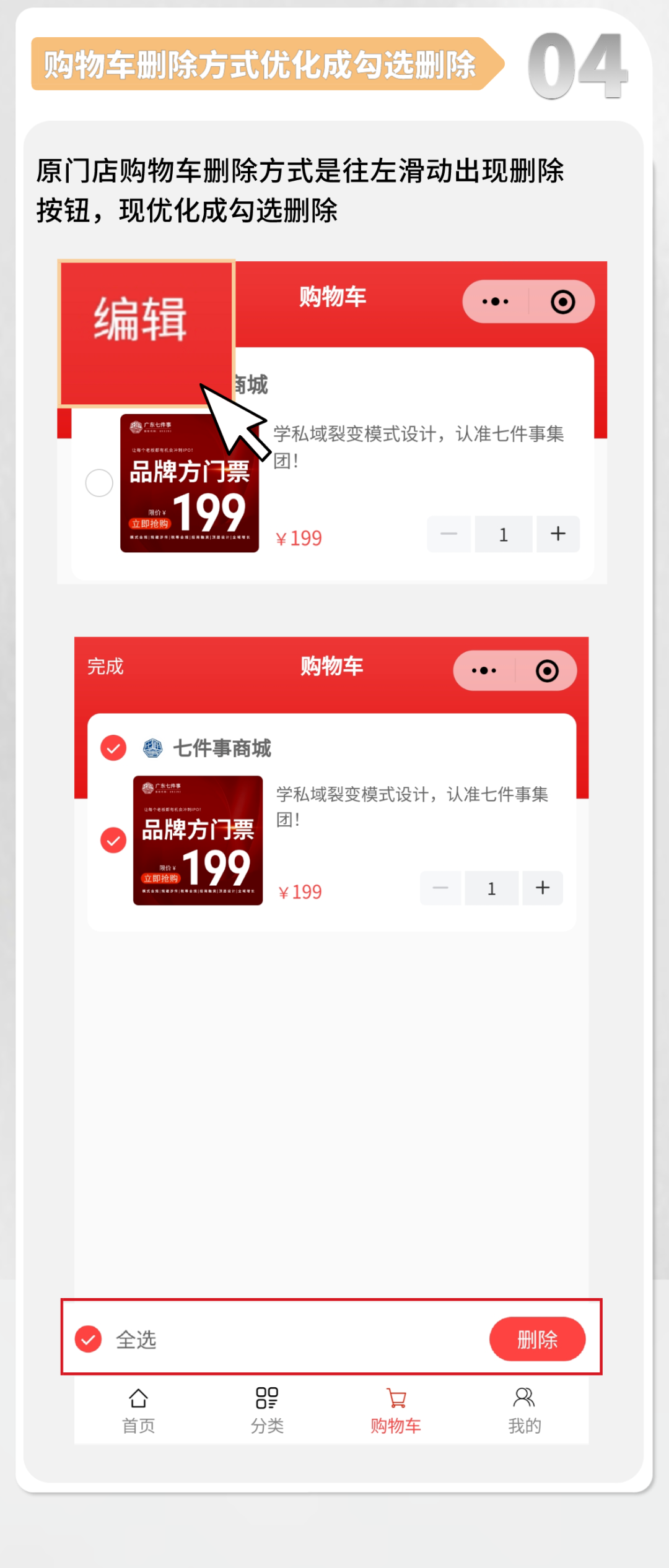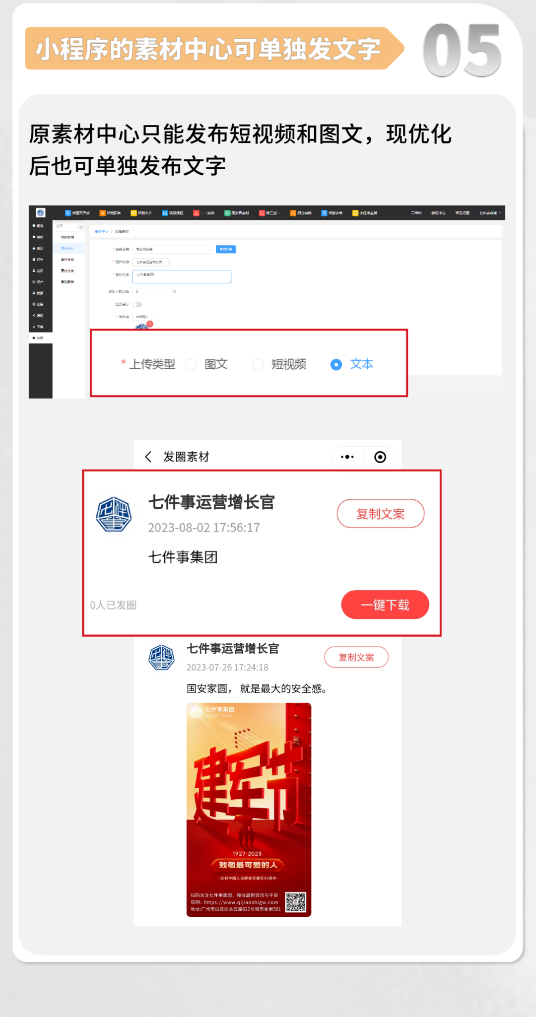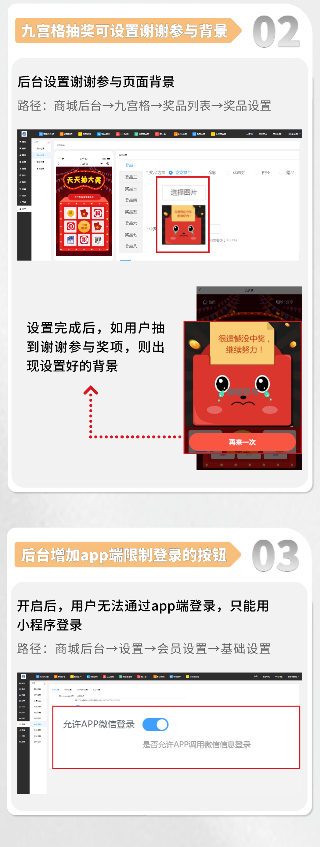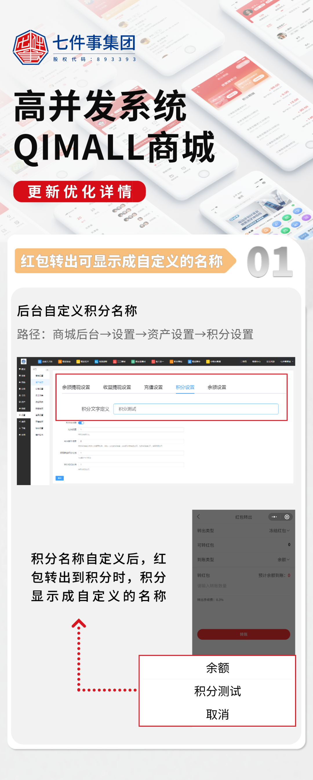 七件事集团一直坚守为客户创造价值,帮助客户成功之初心,在不断完善的路上,致力于为您提供功能更全面的商城系统! (1)会员设置 用户登录增加条件按钮,可自定义设置用户登录时是否需要勾选用户协议、隐私协议 (2)商品规格 原商品上架要单独选择规格,现可自定义商品规格,上架商品可选择设置已有规格 (3)源码版系统 商城增加商城回收站,删除的商城会在回收站里显示,可点击恢复 (4)二二复制 业绩统计不限制选择商品,原业绩统计商品设置只可选择20个,现增加至200个 (5)会员等级 升级条件提高,原v2等级的升级条件是推荐2个v1等级会员,v1用户是推荐2个v1才能升级。现v1等级推荐2个会员等级≥v1等级的人才能升级为v2 (6)团队分红 增加商品参与全局分红设置,原商品默认不参与团队分红,现增加参与开关,开启后商品默认参与全局设置的分红